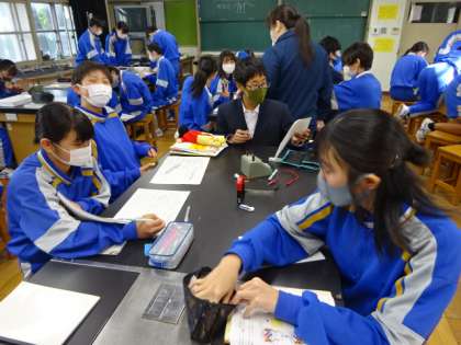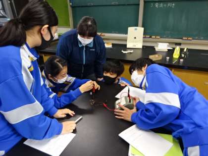 2年4組、理科。「発電機のしくみ コイルの中の磁界を変化させて、電流が発生するか調べる」