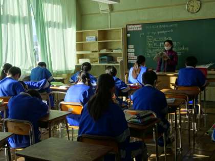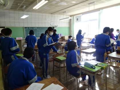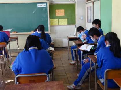 1年1・2組、英語。「Lesson8 それぞれの冬休み(今していることについて説明する)」