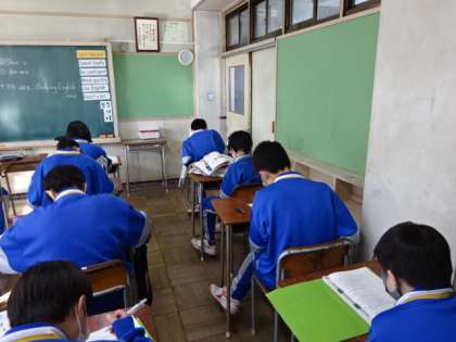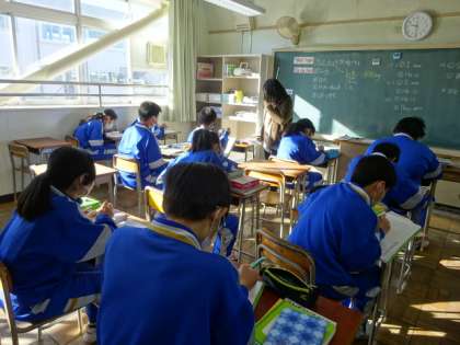 1年1・2組、英語。「Lesson8 それぞれの冬休み(今していることについて説明する)」