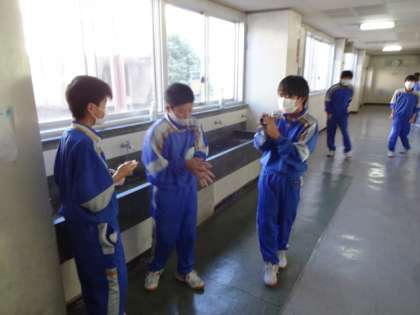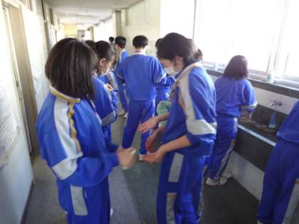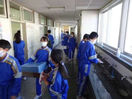 1年生の昼食前の様子です。しっかり手洗い、希望者はアルコールで手指消毒。