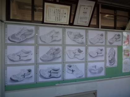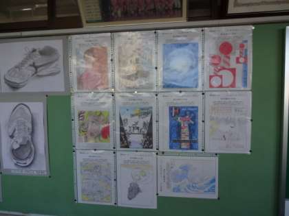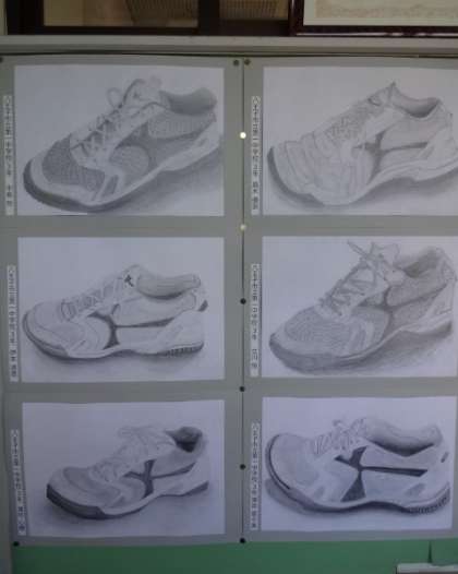 職員室前の掲示板です。上履きのデッサンと模写が掲示されています。