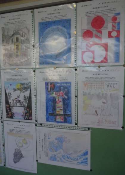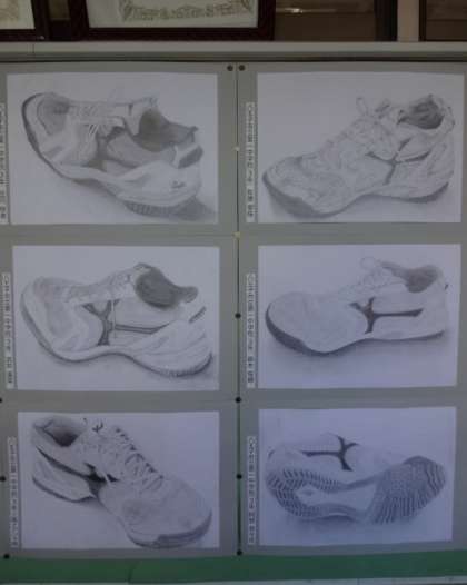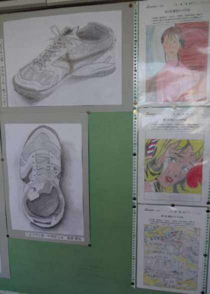職員室前の掲示板です。上履きのデッサンと模写が掲示されています。