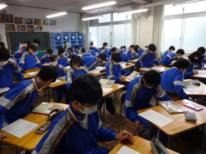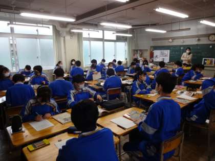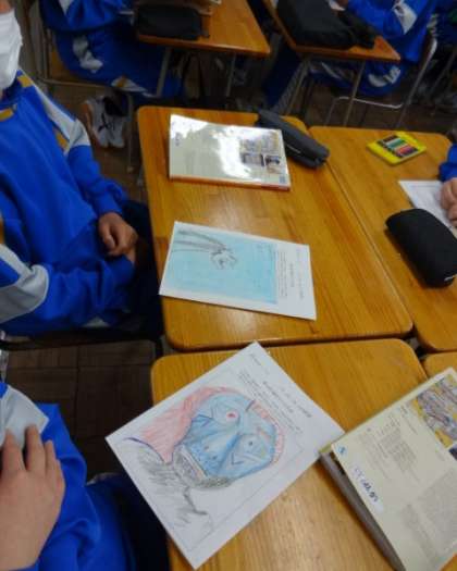2年3組、美術。「模写クイズ大会 資料集から有名な作品をたくさん知ろう!」