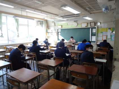 1時間目の3年1組、社会。今日は都立高校推薦入試の発表日。登校している生徒が少ないです。