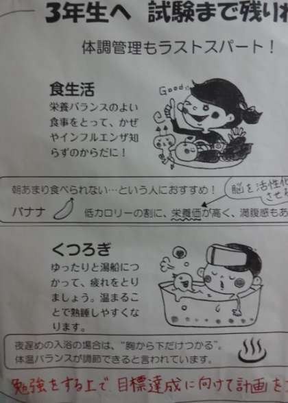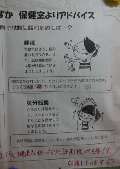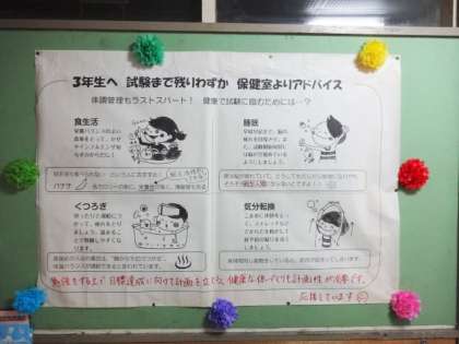 保健室前の掲示です。「3年生へ 試験まで残りわずか 保健室よりアドバイス」