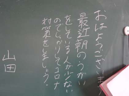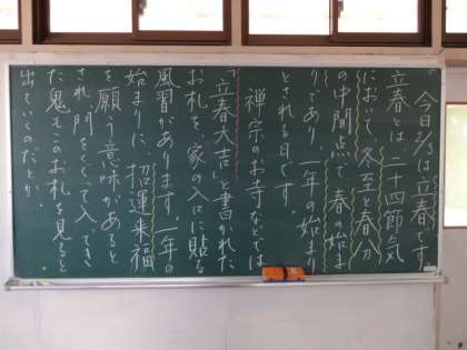 学年掲示板。朝のうがい(1年)。立春大吉(2年)。