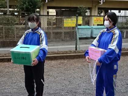 今朝は曇り空でした。この後天気は回復してくるそうですが、寒い一日です。生徒会本部のユニセフ募金が始まりました(8日〜10日)。