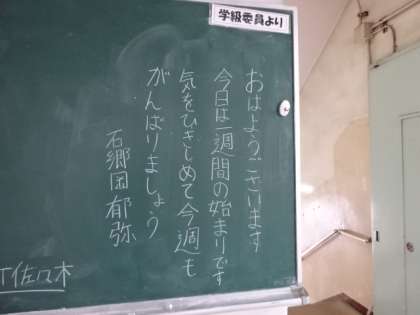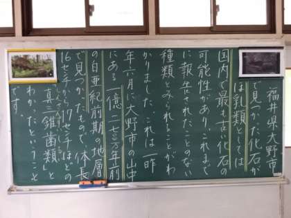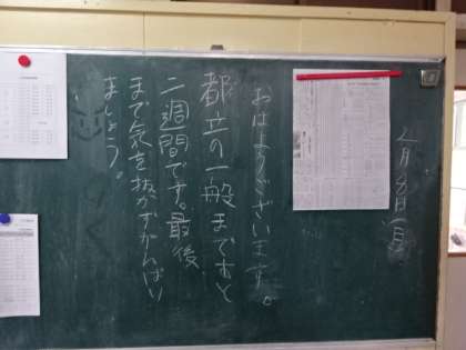 学年掲示板。気を引きしめて(1年)。あと二週間(3年)。1億2700万年(2年)。