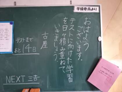 学年掲示板。テストに向けた学習(1年)。今の努力(2年)。