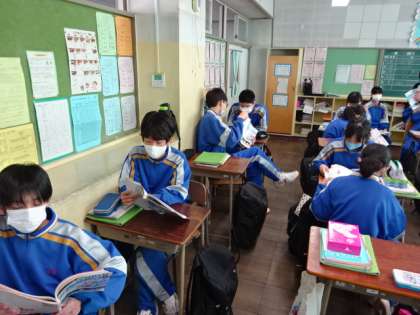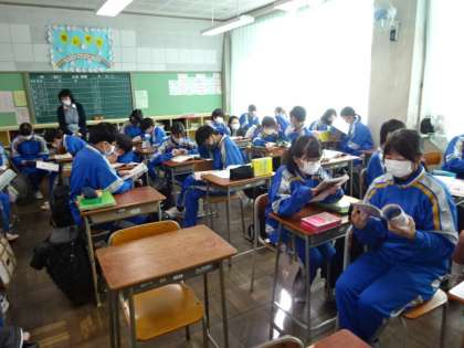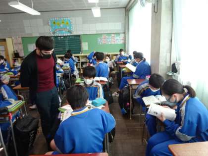 1年3組、英語。ペアで会話の練習。ALTケン先生が入っています。