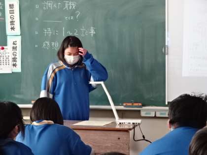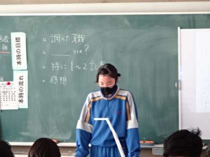 1年生が、昨日の6時間目に「職業調べ」の個人発表を行いました。2組。