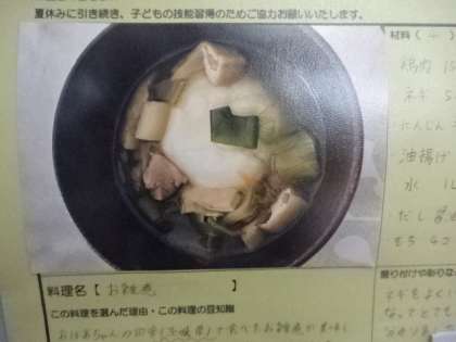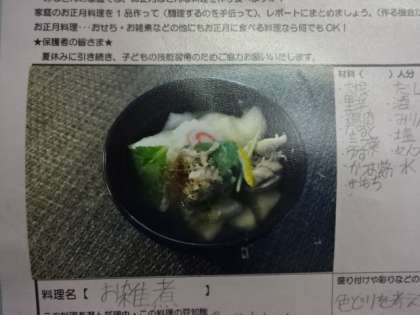 被服室前の掲示です。「地域の味を伝えるお雑煮 関東風?関西風?」
