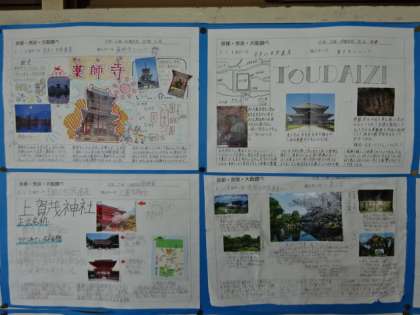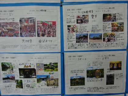 2年生の廊下の掲示です。9月の修学旅行に向けて調べました。2組。