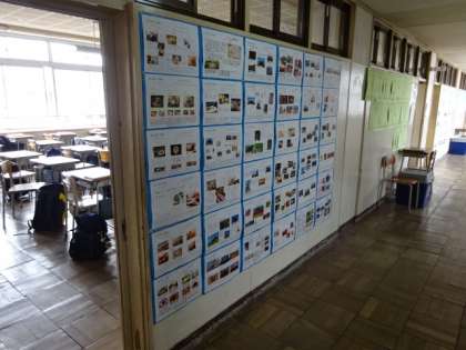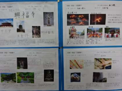 2年生の廊下の掲示です。9月の修学旅行に向けて調べました。3組。