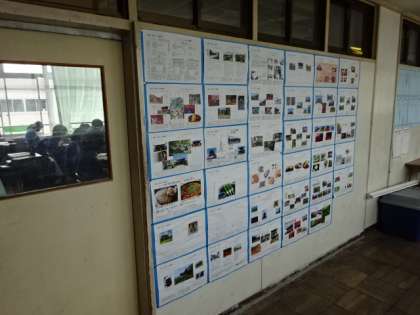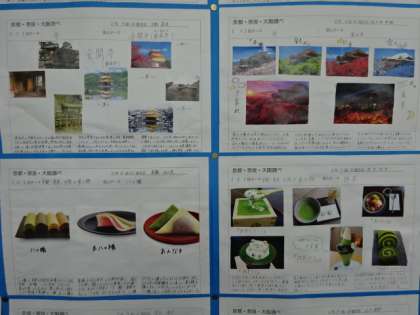 2年生の廊下の掲示です。9月の修学旅行に向けて調べました。4組。