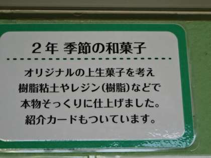 職員室の前に掲示してあります。2年生が美術で制作した「季節の和菓子」の写真です。おおるり展(今年は市のHPに掲載されます)に出品された生徒の作品です。
