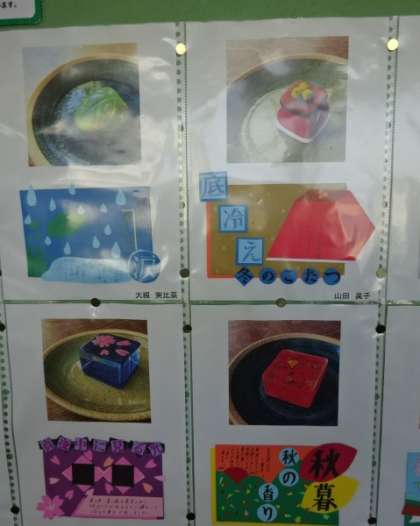職員室の前に掲示してあります。2年生が美術で制作した「季節の和菓子」の写真です。おおるり展(今年は市のHPに掲載されます)に出品された生徒の作品です。オリジナルの上生菓子を考え樹脂粘土やレジン(樹脂)などで本物そっくりに仕上げました。紹介カードも付いています。