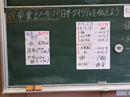 3年1組、家庭科、調理実習。祝卒業記念!!日本クオリティを伝えよう。かきたま汁。
