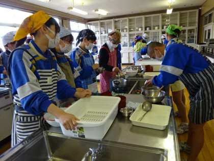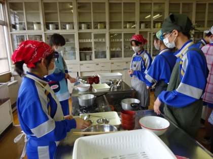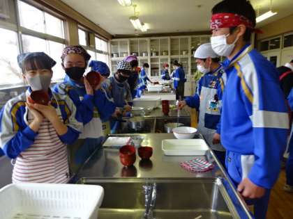 3年1組、家庭科、調理実習。祝卒業記念!!日本クオリティを伝えよう。かきたま汁。