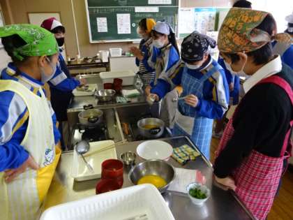 3年1組、家庭科、調理実習。祝卒業記念!!日本クオリティを伝えよう。かきたま汁。