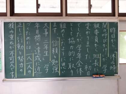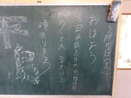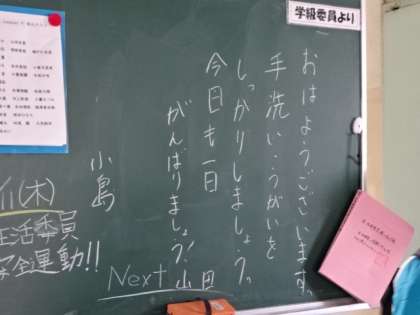 学年掲示板。今日も一日がんばりましょう(1年)。おはよう(3年)。休み時間の呼びかけ(2年)。