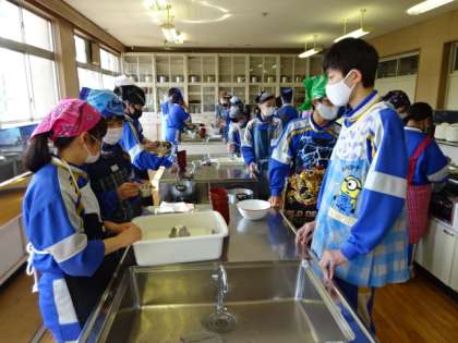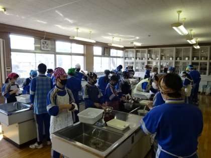 3年3組、家庭科、調理実習。祝卒業記念!!日本クオリティを伝えよう。かきたま汁。