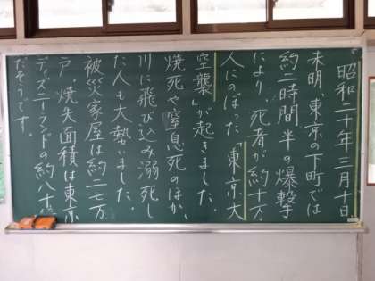 学年掲示板。全力で楽しみましょう(3年)。勉強と部活動を両立(1年)。東京大空襲(2年)。