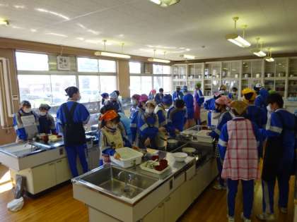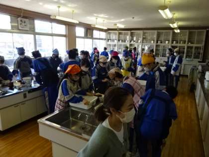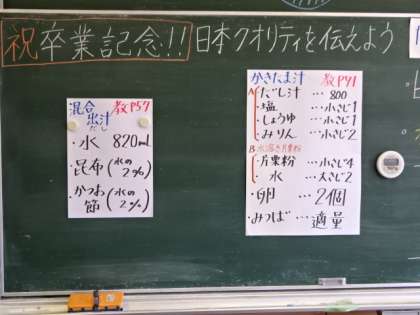3年2組、家庭科、調理実習。祝卒業記念!!日本クオリティを伝えよう。かきたま汁。