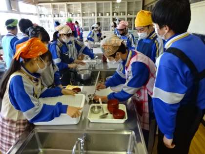 3年2組、家庭科、調理実習。祝卒業記念!!日本クオリティを伝えよう。かきたま汁。