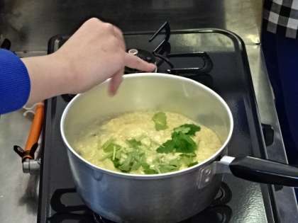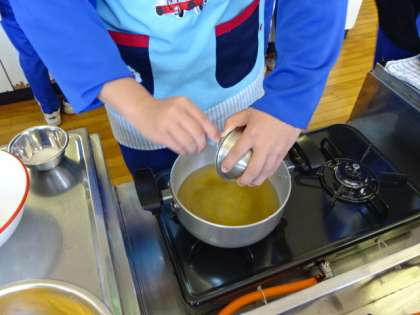 3年2組、家庭科、調理実習。祝卒業記念!!日本クオリティを伝えよう。かきたま汁。