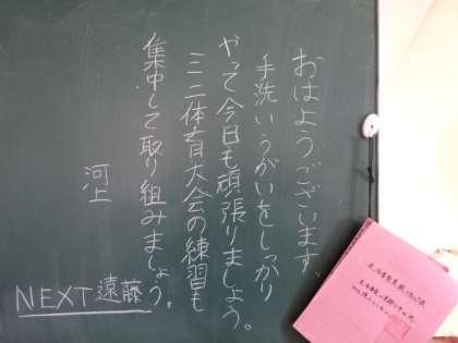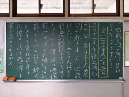 学年掲示板。東日本大震災(2年)。今日も頑張りましょう(1年)。
