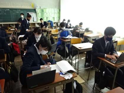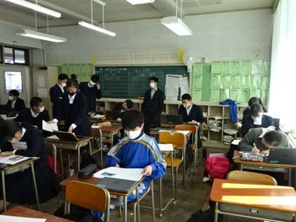 卒業研究。配られた学習用端末を使って「卒業研究」です。自分でテーマを決めて研究します。3年2組。
