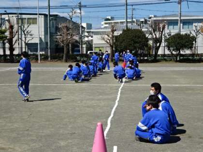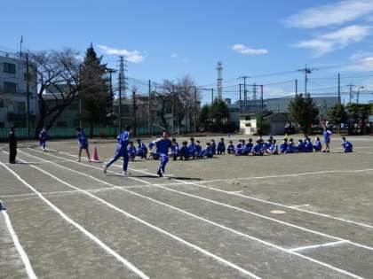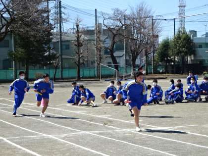 2年1・2組、体育。ミニ体育大会の全員リレーの練習です。