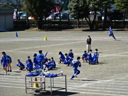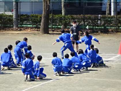 2年3・4組、体育。ミニ体育大会の全員リレーの練習です。