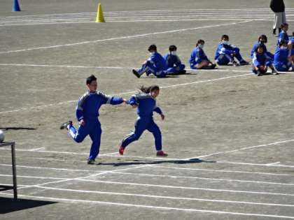 2年3・4組、体育。ミニ体育大会の全員リレーの練習です。