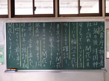 学年掲示板。学年練習(1年)。サクラが開花した(2年)。