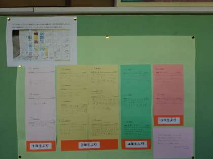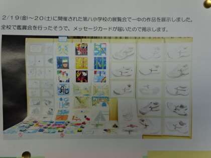 第八小学校の展覧会に第一中学校の作品を展示していただきました。小学生のみなさんから届いたメッセージカードです。職員室前に掲示してあります。