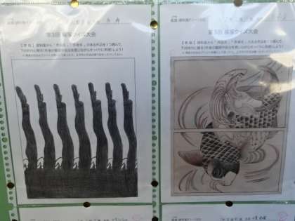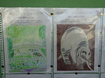 美術の授業で行っている「模写クイズ大会」。1・2年生の優秀作品が職員室前に掲示されています。