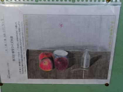 美術の授業で行っている「模写クイズ大会」。1・2年生の優秀作品が職員室前に掲示されています。