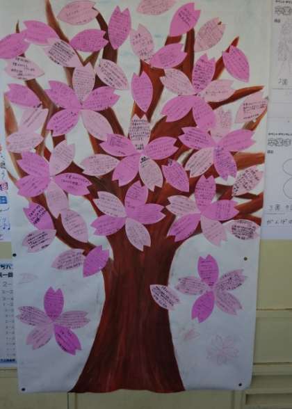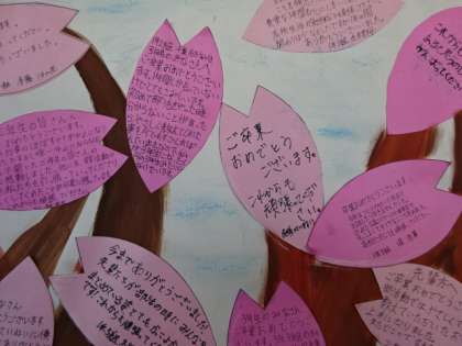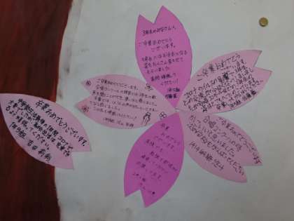 1・2年生から3年生へメッセージ。3年生の廊下に貼ってあります。3年1組の前の木。