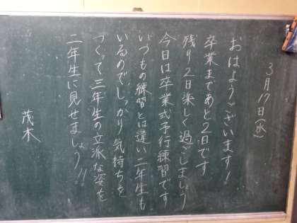 卒業式予行練習、しっかり気持ちをつくって、三年生の立派な姿を二年生に見せましょう!!(3年)。