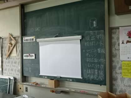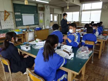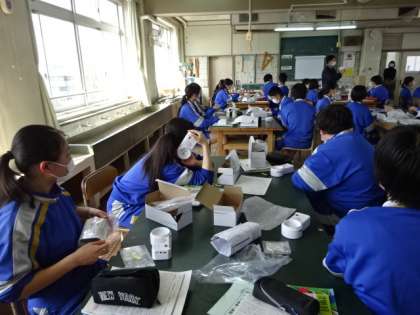 2年1組、技術。ボトルランタンダイナモの製作が終わり、先生が使用方法の確認をしていました。