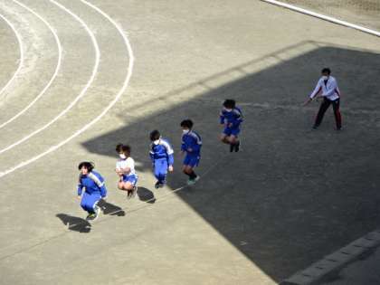 7組、体育。1・2年生で大縄跳びに挑戦です。