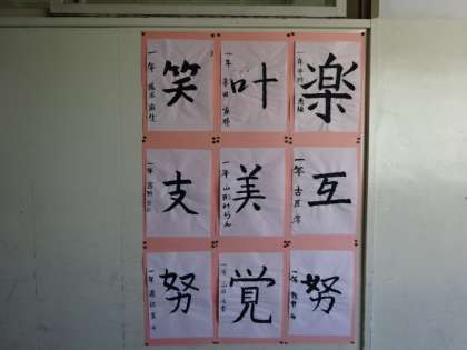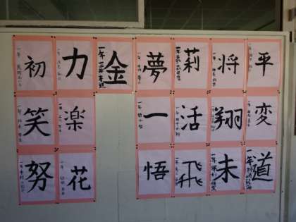 1年生の廊下に掲示されている書写の作品です。1組。