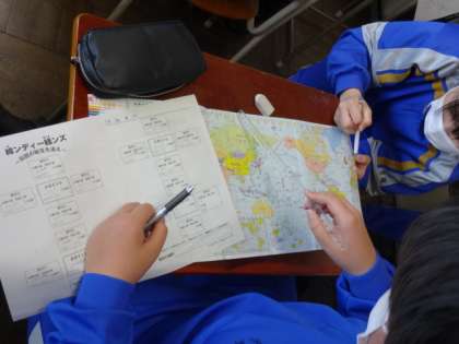2年1組、社会。「緯ンディー経ンズ」伝説の秘宝を追え。協力して問題に取り組んでいます。