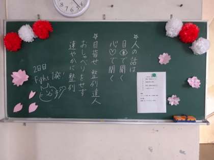 学年掲示板。人の話は(1年)。言葉にしてこそ(3年)。