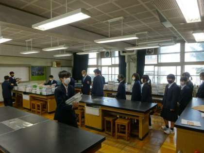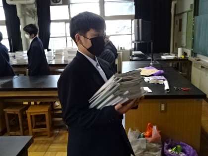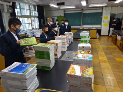 全校生徒に今年度使用する教科書を配りました。1年生が最も多い冊数です。1年4組の様子です。