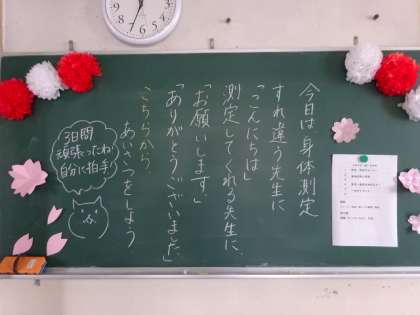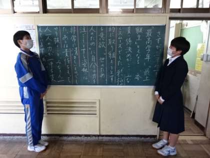 学年掲示板。こちらからあいさつ(1年)。世のため人のため(3年)。