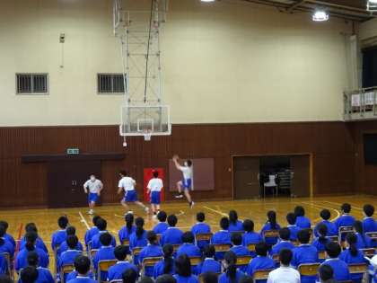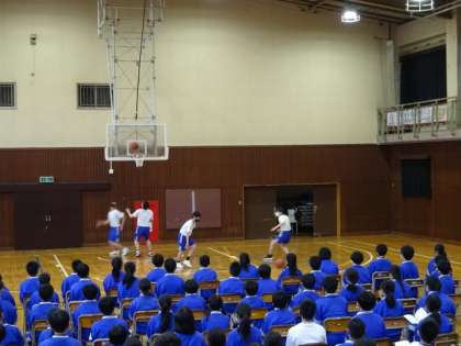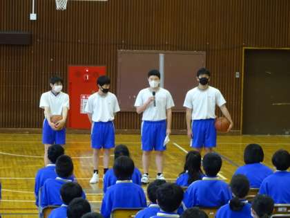 1年生に向けた一中ガイダンスです。部活動の紹介です。男子バスケットボール部。