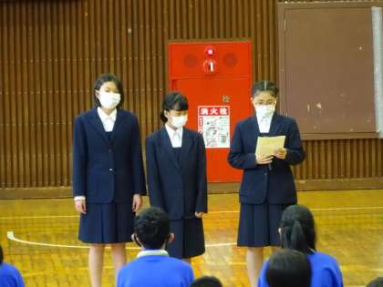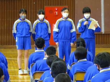 1年生に向けた一中ガイダンスです。部活動の紹介です。理科部。合唱部。英語部。